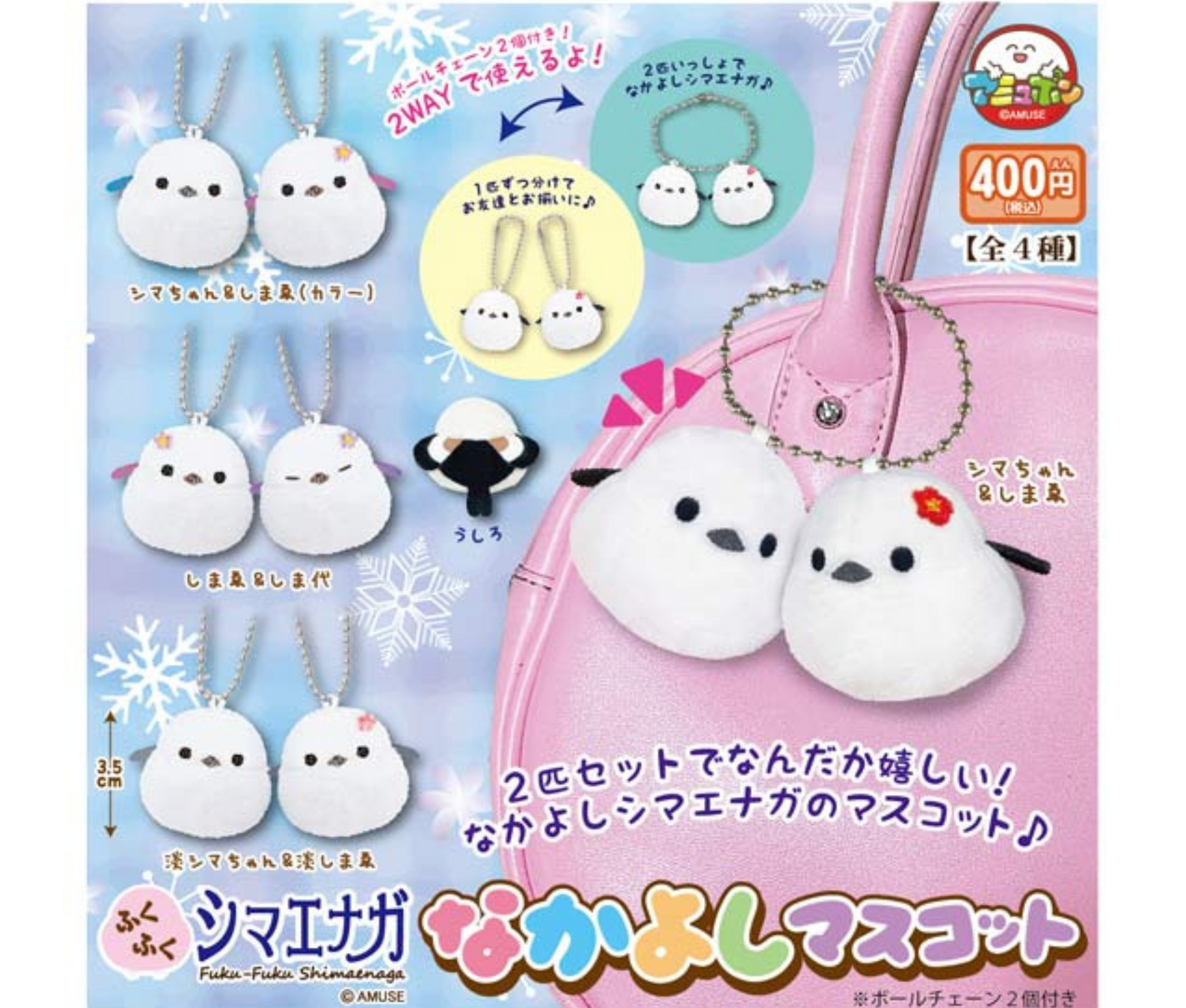 北海道の雪の妖精「シマエナガ」をモチーフにした、ふわふわで可愛い仲良しマスコット! 全4種類のラインナップで、親子や仲良しペアの愛らしい表情が楽しめます。デスクやバッグに飾れば、癒しのひとときをプラスできるガチャコレクションです。