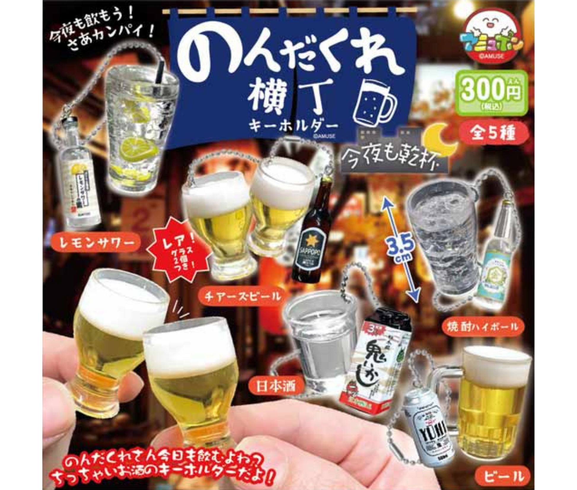 「のんだくれ横丁キーホルダー 今夜も乾杯」は、酒場の賑やかな雰囲気と個性的なキャラクターたちをモチーフにしたキーホルダーシリーズ。