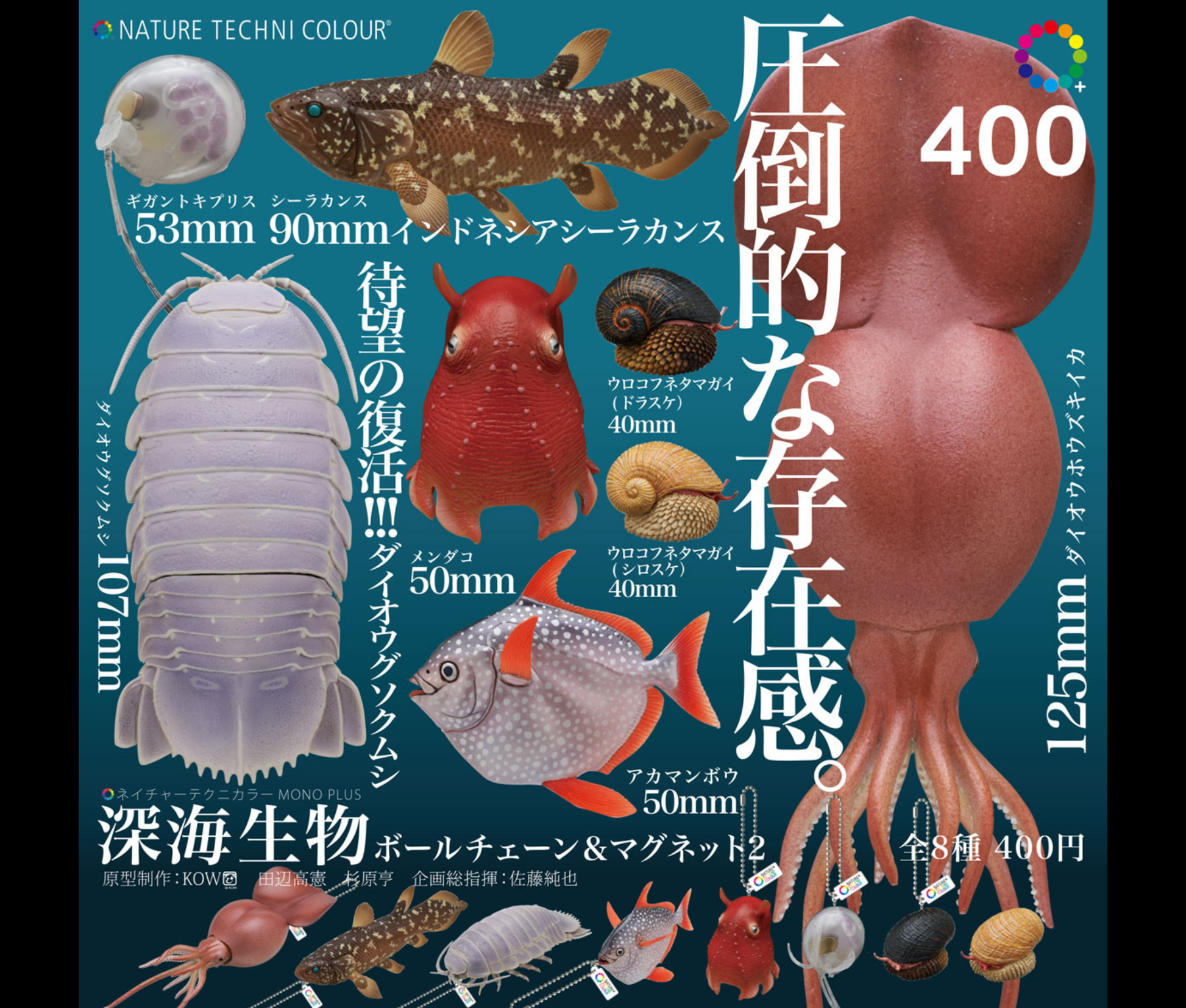 NTC MONO+「深海生物 マグネット&ボールチェーン2」は、リュウグウノツカイ243mmをはじめ、シーラカンス、メンダコ、ラブカなど全8種をラインナップ。マグネットとボールチェーン付きで、バッグやボードに飾っても映えるアイテムです。