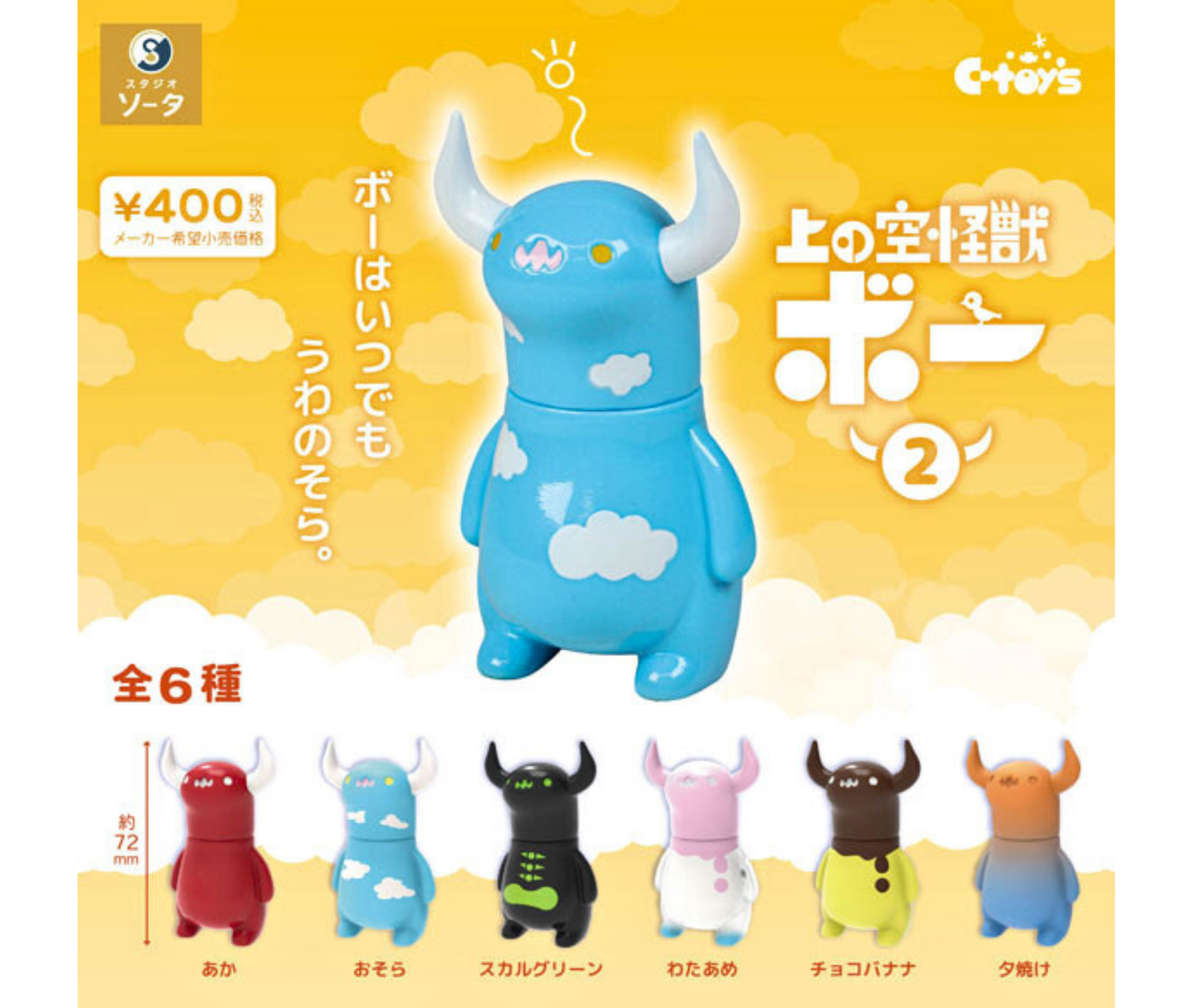 シュールで個性的な怪獣たちが再び登場! 「上の空怪獣ボー2」は、イラストレーター・ちしまこうのすけ氏による独特のデザインを元にしたカプセルトイシリーズ。思わず微笑んでしまう表情や形状のバリエーションが楽しめ、見るたびに新しい発見がある、コレクション性の高いアイテムです。
